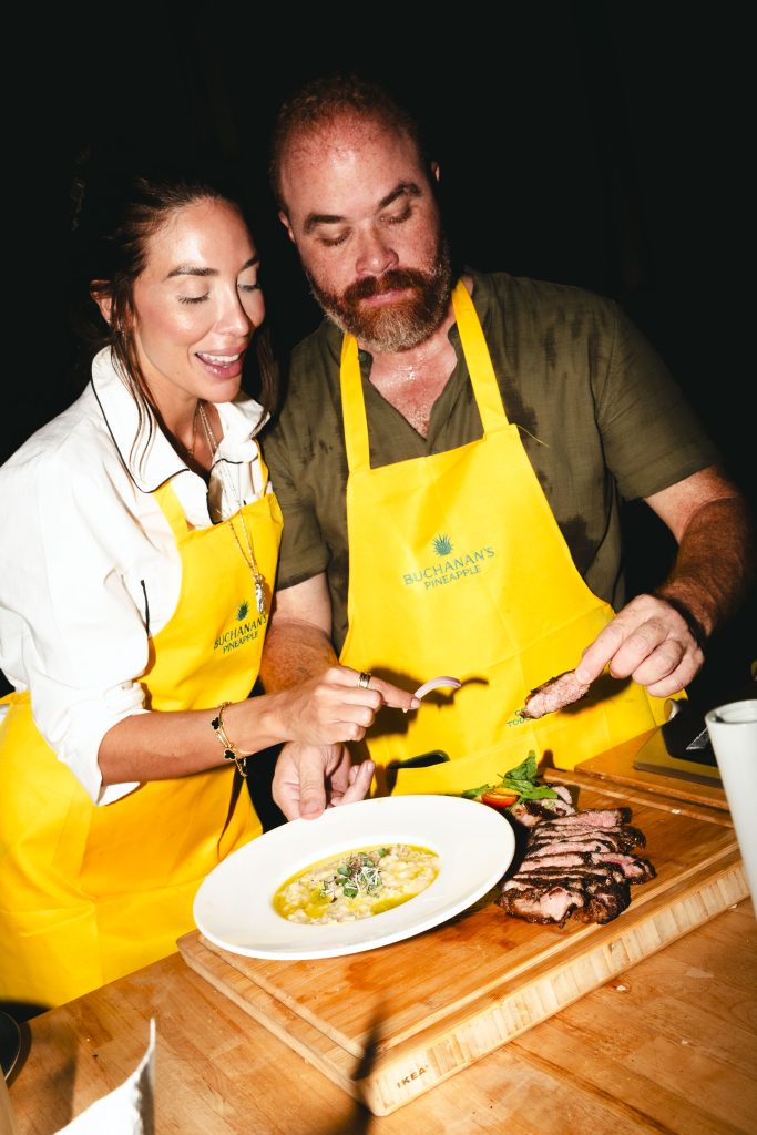 Durante la noche, cada dupla —formada por el invitado y su persona elegida— cocinó un menú tropical diseñado especialmente para Buchanan’s Pineapple, donde la piña fue el ingrediente protagonista en cada plato. La experiencia comenzó con taquitos de cerdo acompañados de pico de gallo de piña, seguidos por un corte New York Strip Loin servido con risotto de parmesano, ensalada de hojas frescas y piña asada. Este plato principal fue acompañado por el Piña Fizz, un cóctel a base de Buchanan’s Pineapple y agua mineral, servido con una rodaja de piña, que complementó a la perfección los sabores del plato. Para cerrar la velada, los asistentes disfrutaron de un postre de helado de vainilla con chutney de piña y cardamomo, maridado con un Frozen Piña Colada preparado con Buchanan’s Pineapple, jugo de piña, crema de coco y un delicado toque de lima y especias caribeñas.